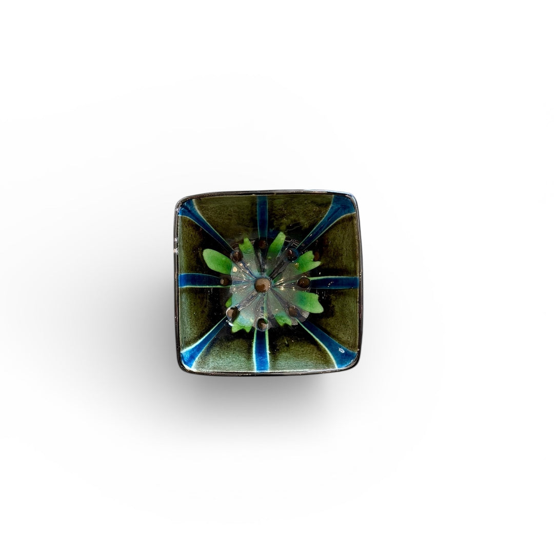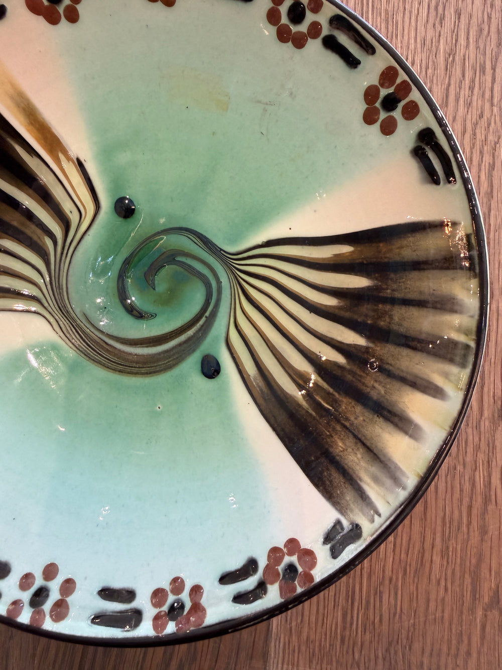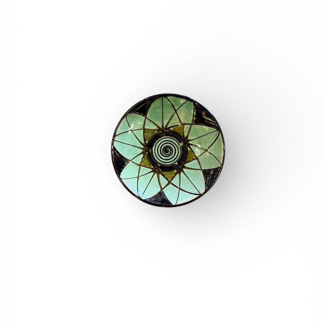 Vintage Small Flat Dish by HAK, Denmark, Signed | Green Flower w/ Spiral Center