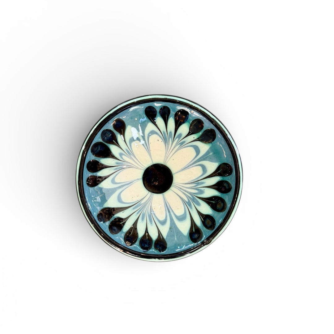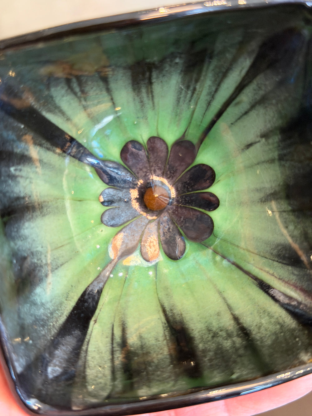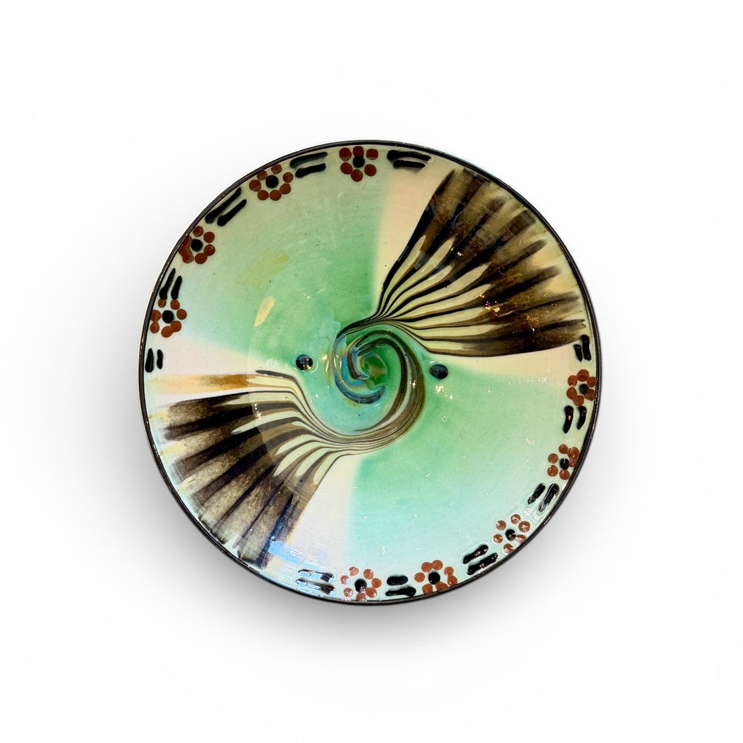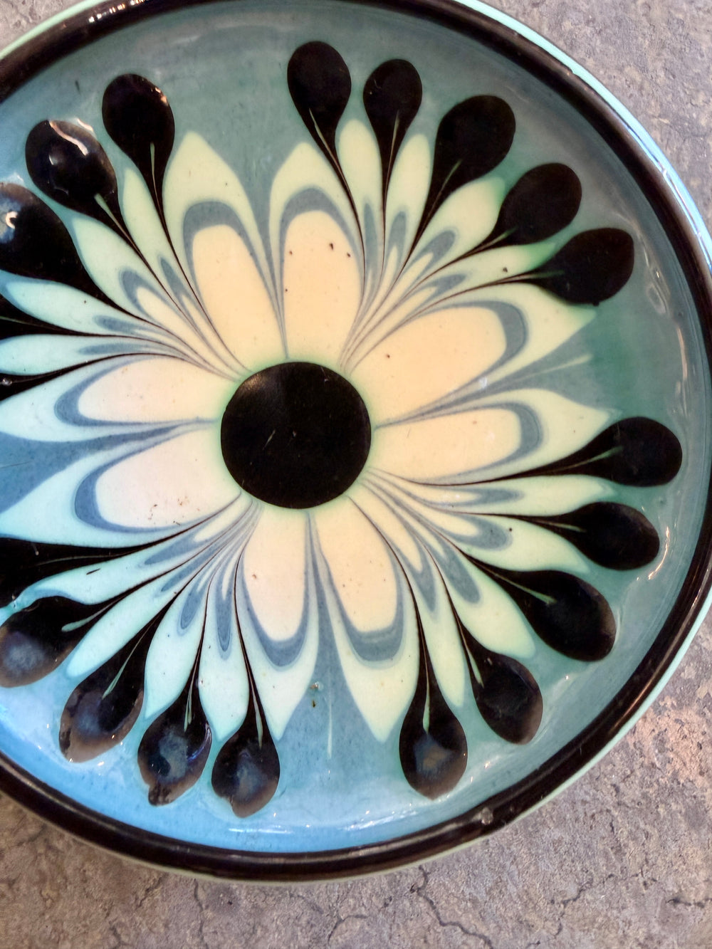 Vintage Small Flat Dish by HAK, Denmark, Signed | Green Flower w/ Spiral Center