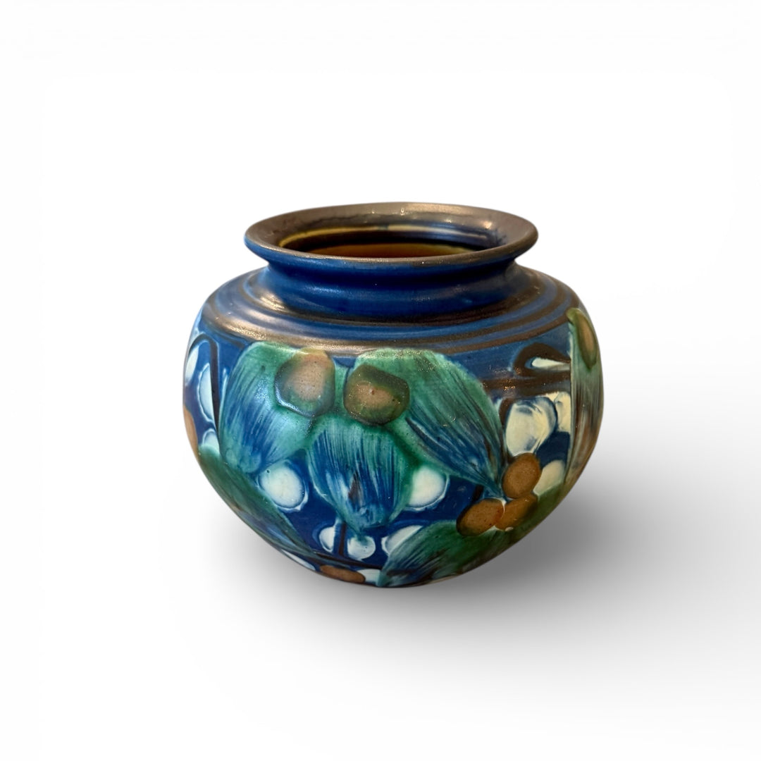 Vintage Round Blue Pottery Vase w/Green Leaves + Berries by HAK, Denmark, Signed