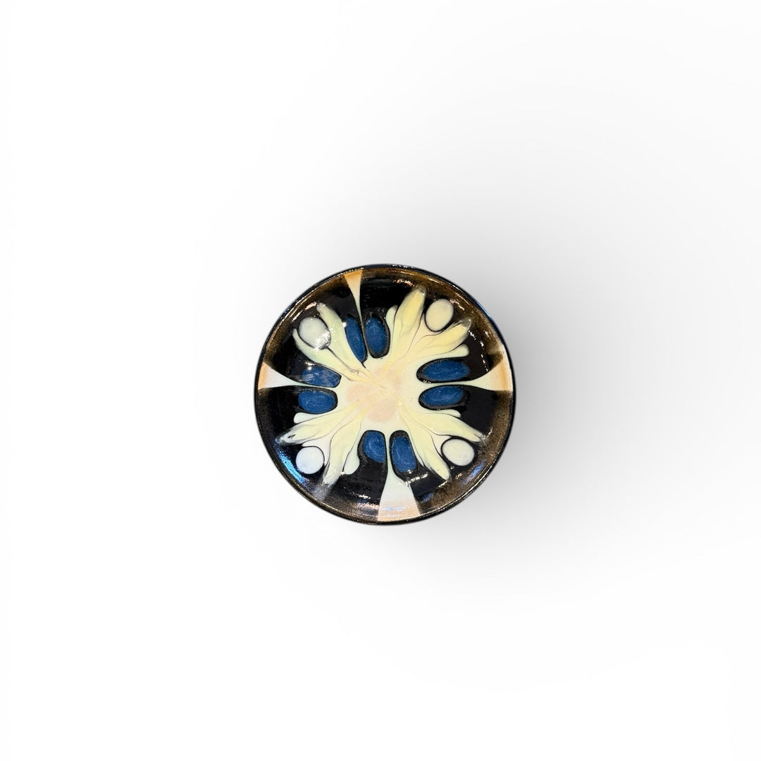 Vintage Small Flat Dish by HAK, Denmark, Signed | Black, White + Mustard Swirl