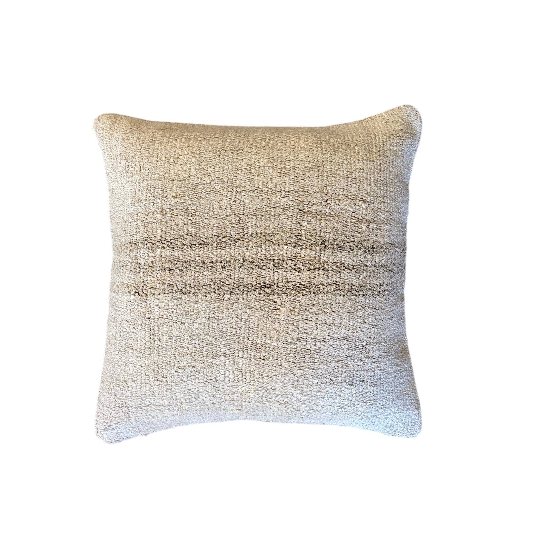 Custom double sided pillow made from a vintage hemp rug accented with flax stripes from Turkey and a cotton back, with a new down insert.