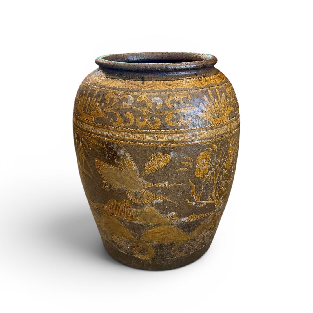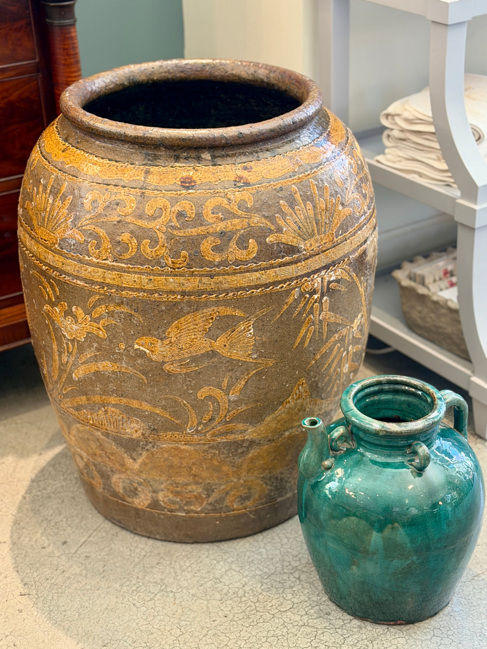 Large Vintage Chinese Stoneware Pickling Jar w/ Bird + Bamboo Motif