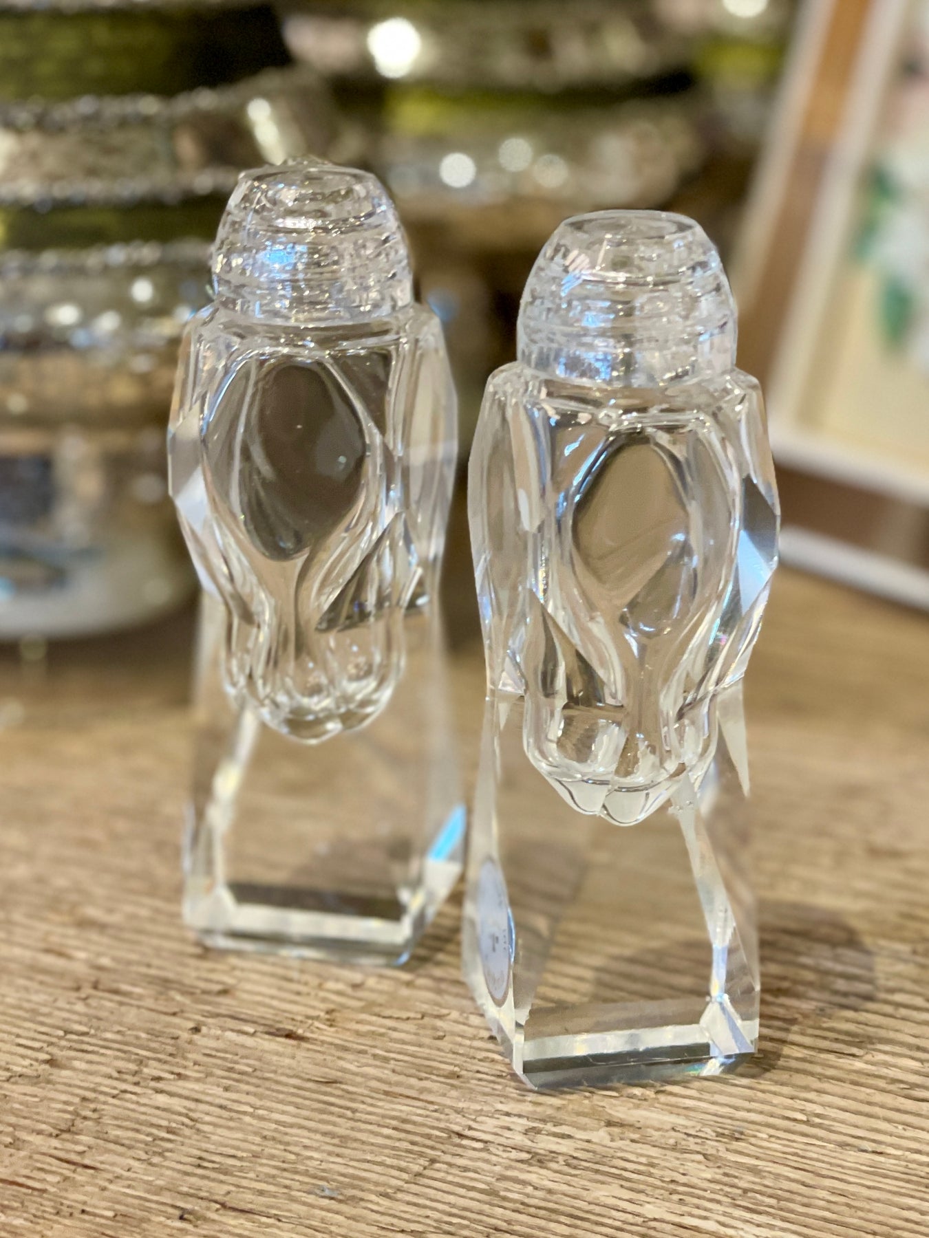 This chic set features a sleek, geometric design with faceted edges and a sculptural, clear crystal body that reflects light beautifully. The tops are rounded with a textured pattern, while the bodies taper slightly down to square bases. Thorpe was known for her elegant and minimalist designs, and these exemplify her refined aesthetic. It is both functional and decorative, ideal for a stylish dining table.
