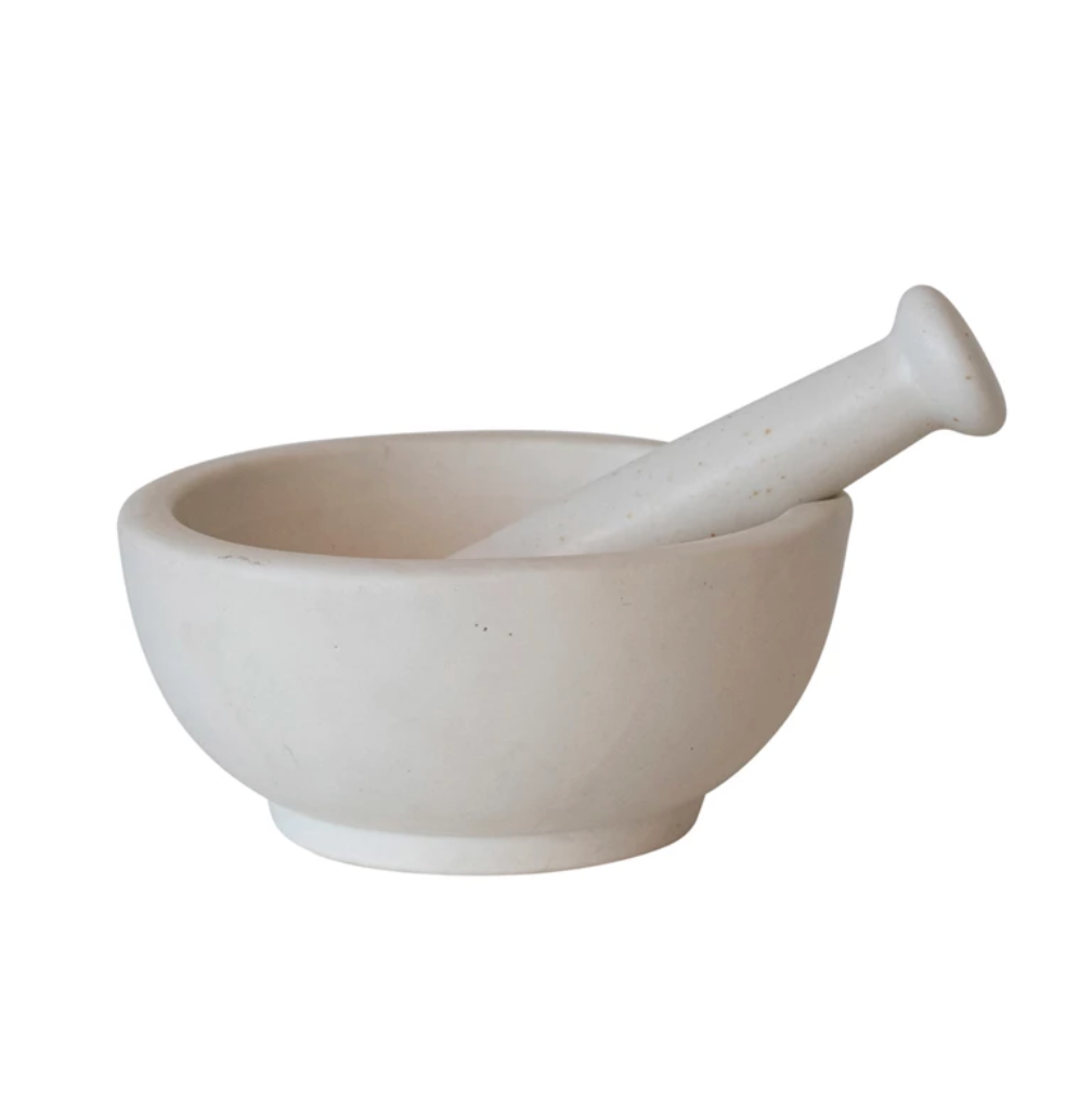 This oversized round stoneware mortar and pestle is an elegant and useful addition to any kitchen. Perfect for grinding spices, herbs, nuts, or garlic, releasing their natural flavors and aromas, it also can be used for preparing sauces, dips, marinades, dressings or as a decorative item. It is resistant to stains and odors, made of durable stoneware and is easy to clean. This set makes a perfect gift or addition to the kitchenware collection.