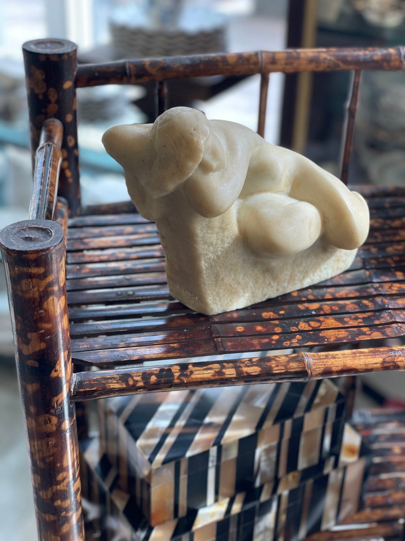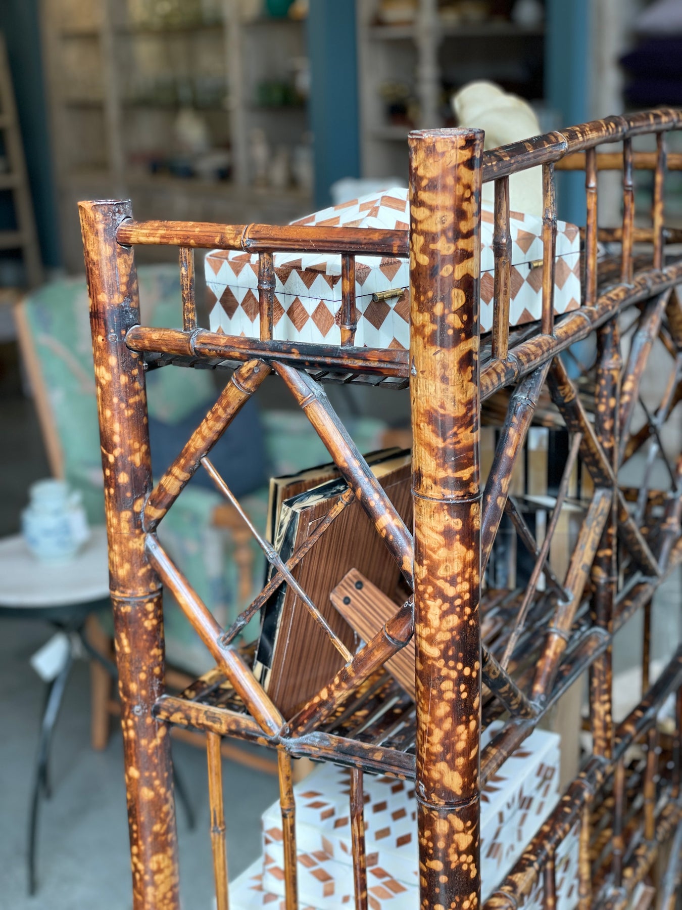 How elegant is this early 20th century tortoiseshell bamboo étagère? This piece has four shelves, is attractive, sturdy and ready to display some of your treasured possessions. Fabulous and functional, it will be that cherished addition to any room.
