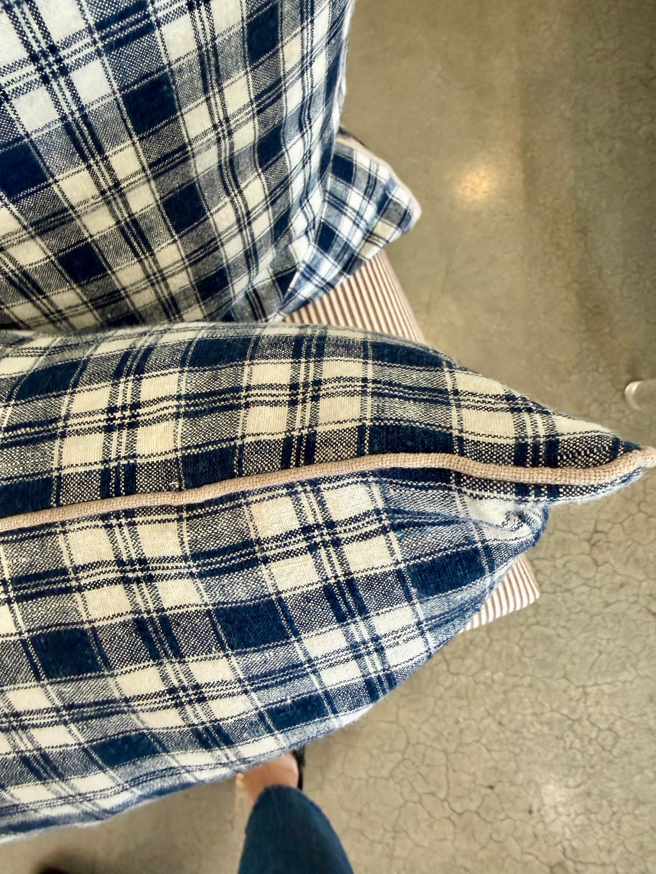 Custom pillow made from vintage handspun French linen featuring blue checks on white with a complementary linen welt and new down insert.