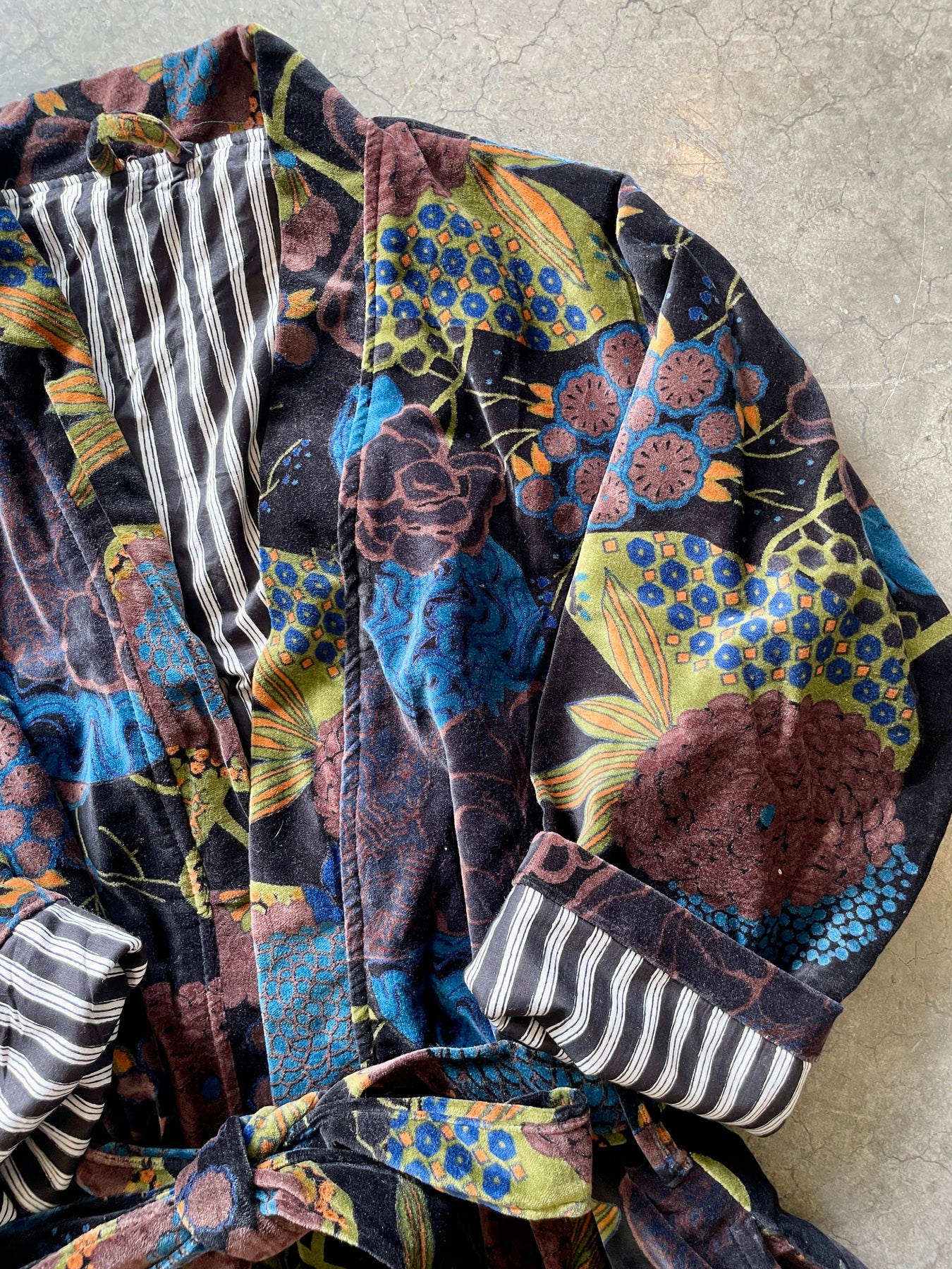Custom robe is hand printed in a jewel tone cotton velvet exterior and lined in a contrasting printed cotton poplin. (Linings may vary)