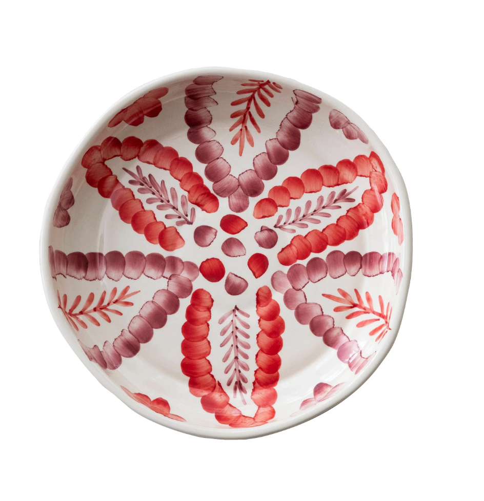 Hand-Painted Shallow Stoneware Serving Bowl w/ Botanical Design