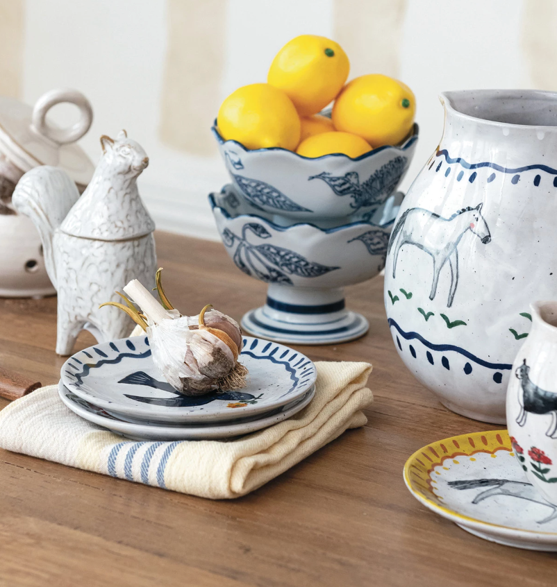 This Oval-Shaped Stoneware Pitcher, adorned with a hand-painted horse print, evokes the rustic charm of a Southwestern landscape. The multi-colored design, complete with a comfortable handle, makes it a practical piece for serving drinks or as an eye-catching centerpiece. Whether used for pouring a cold lemonade on a hot day or displaying wildflowers, this pitcher is sure to gallop its way into heart.
