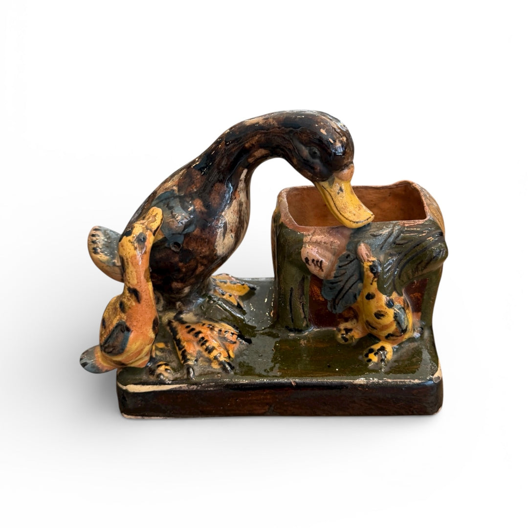 Vintage Mexican Folk Art Pottery Duck + Ducklings Vase