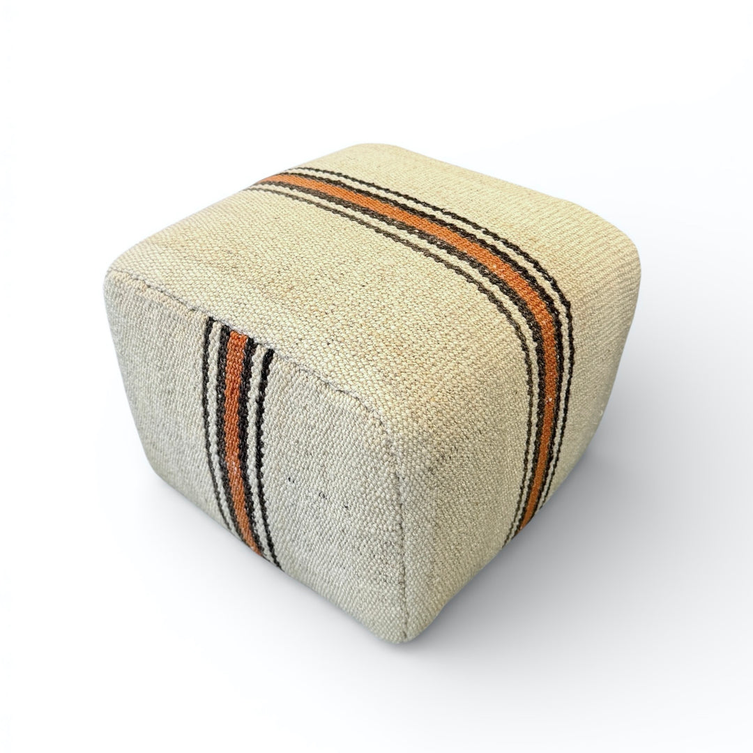 Custom Cube Stool Newly Upholstered in a Vintage Cream w/Orange Stripe Wool Rug, Turkey