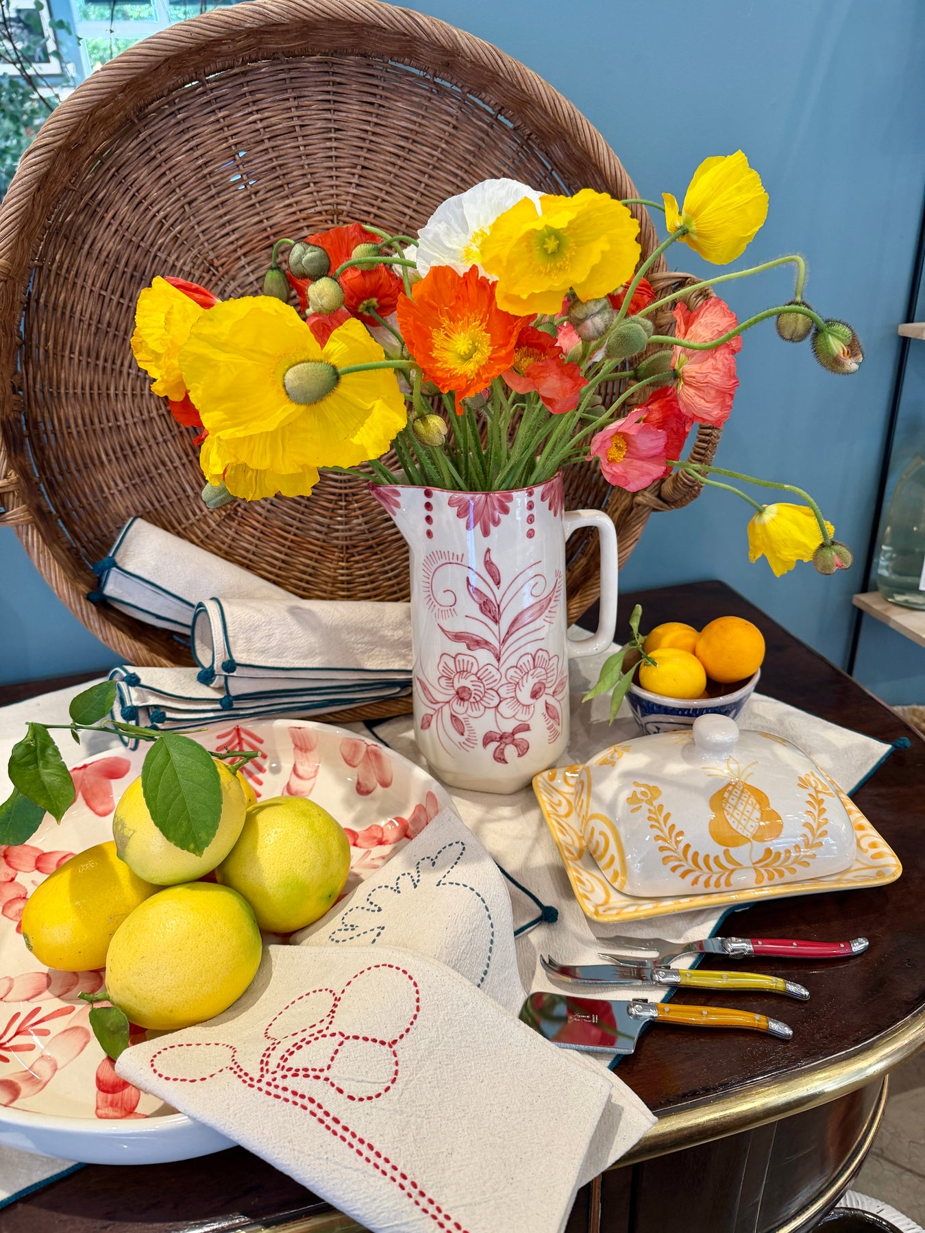 Decorative woven natural rattan tray featuring oversized circular handles for both style and function. Perfect for serving breakfast in bed or creating a beautiful, textural display on a coffee table or ottoman.