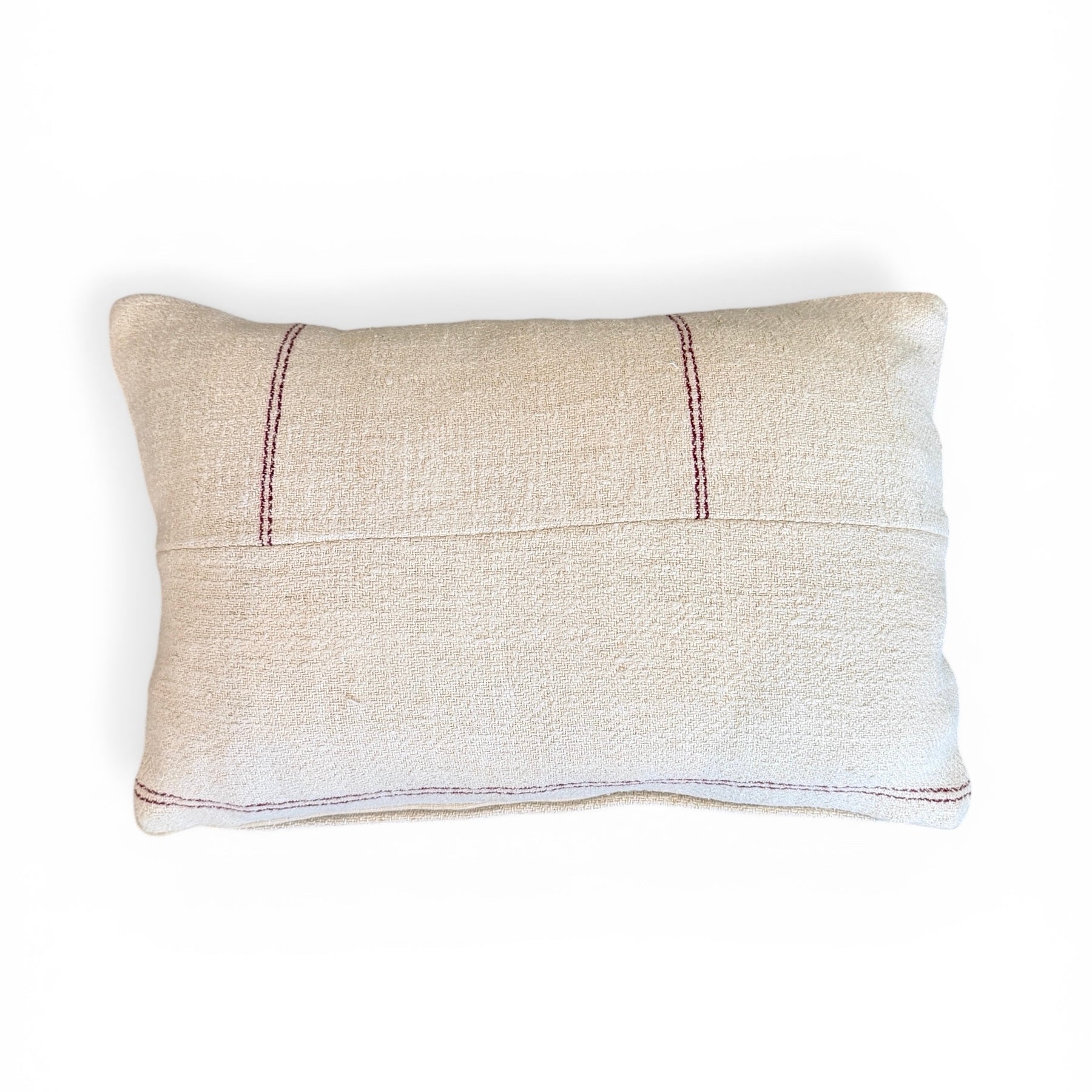 Custom pillow made from a vintage homespun linen from Romania. It features a cream ground with a merlot line pattern, finished with a complementary solid cream linen welt and a new down insert.