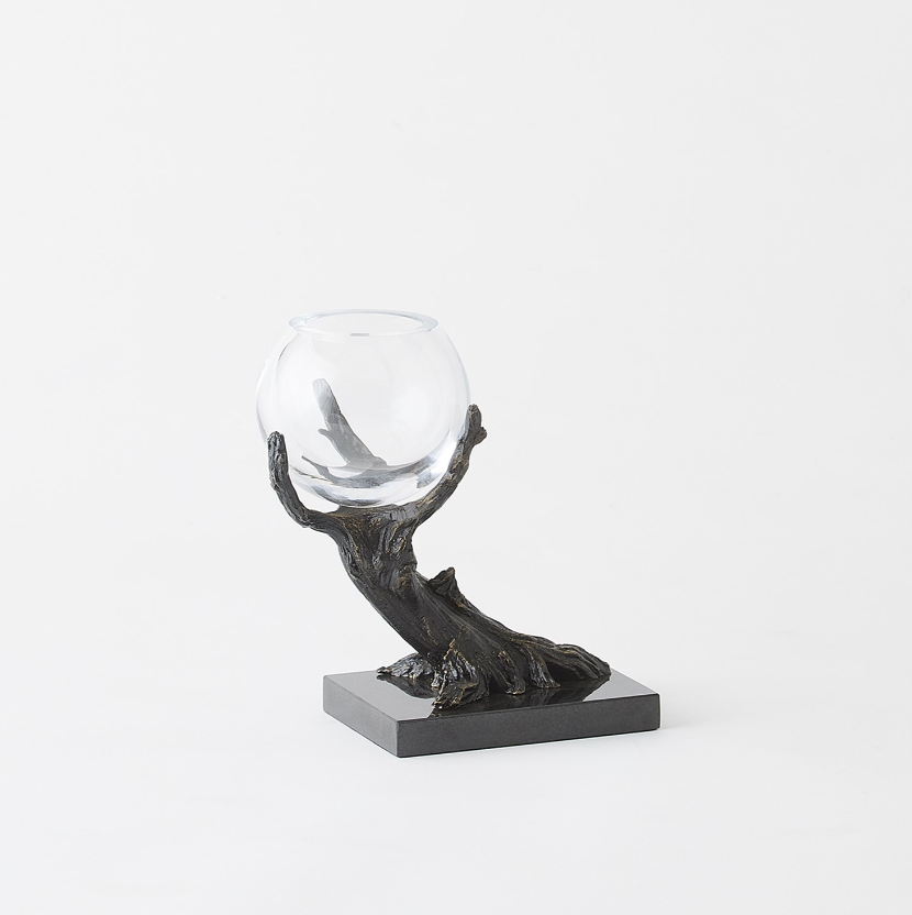 Stems of solid cast iron twist and turn to form the Monterey Vase Holders. This piece features a hand-painted bronze finish on black marble base. This artful holder combines natural elements with refined craftsmanship, creating an elegant accessory for any space. The clear glass vases beautifully showcase small blooms. Display one for a simple look or group together for a striking tablescape.