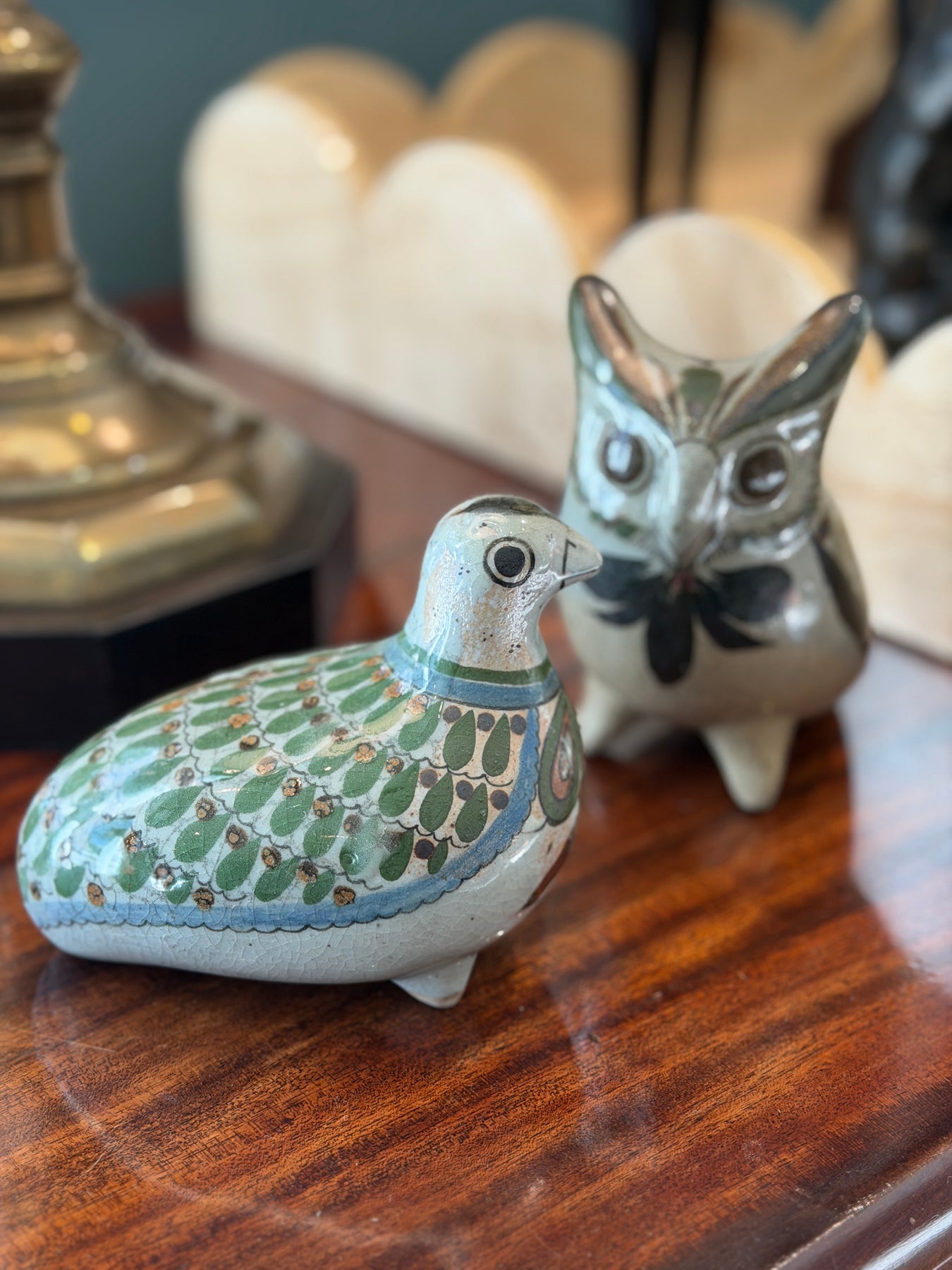This charming vintage ceramic owl figurine is hand-painted and signed by the artist, dating to the circa 1970s. Crafted in Tonalá, a region renowned for its rich ceramic traditions, the piece reflects the expressive forms and folk art character for which Tonalá pottery is celebrated.