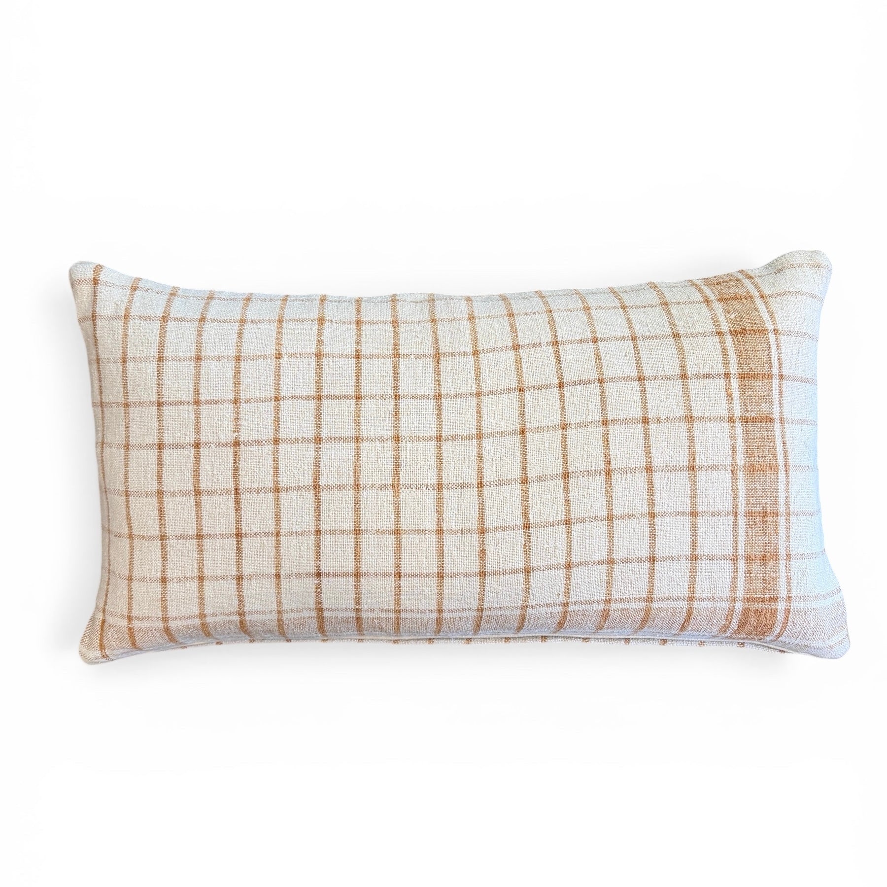 Custom pillow made from a vintage homespun linen from Romania. It features a cream ground with an ochre grid design, finished with a complementary solid cream linen welt and a new down insert.