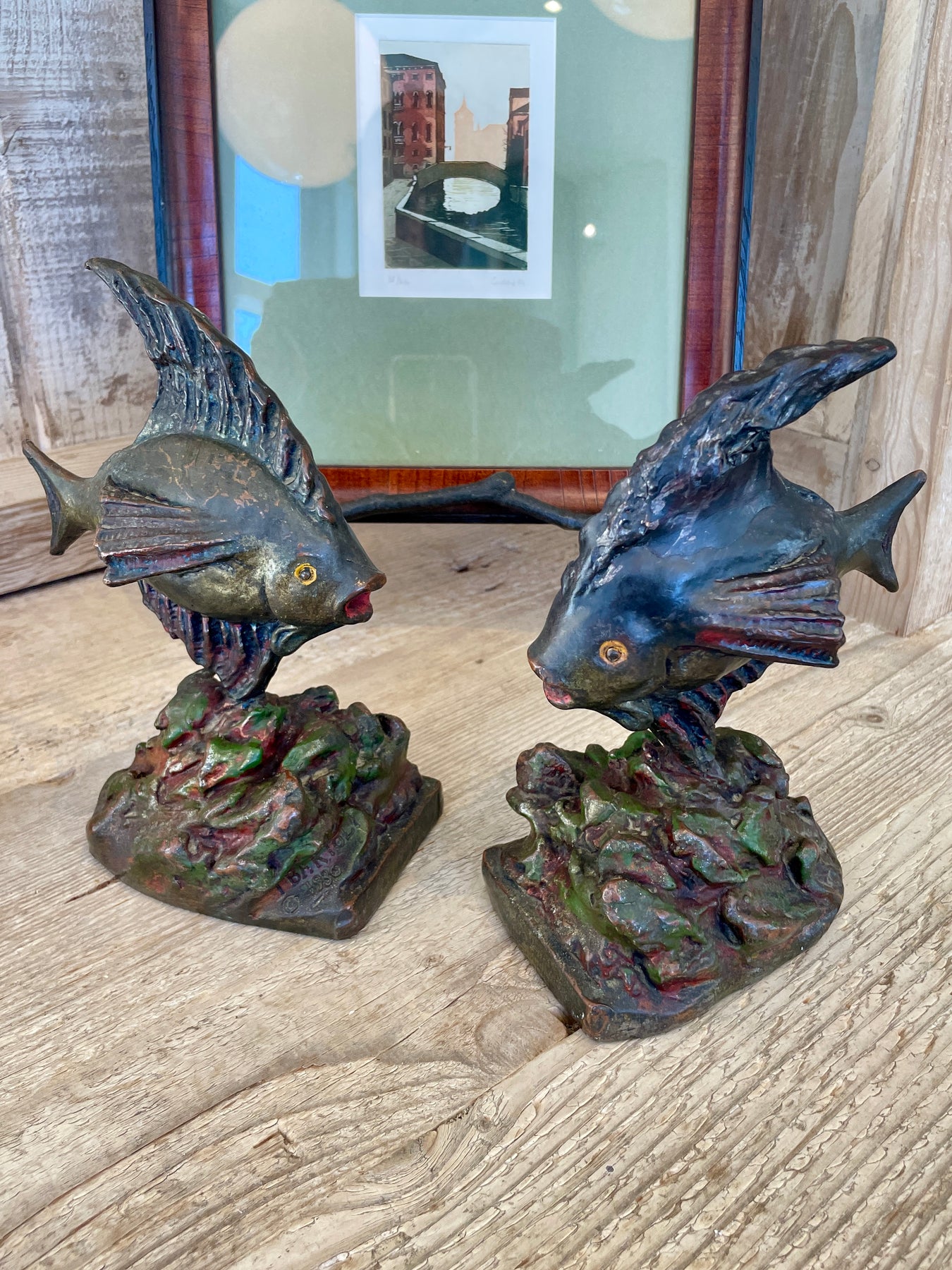 Vintage Bronze Fish Bookends, Dated 1930 | Pair